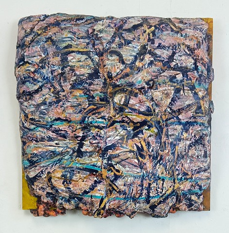 mirrored glass, paint and paper put through washing machine, graphite (television dictation mixed with dreams) iodine on wood panel