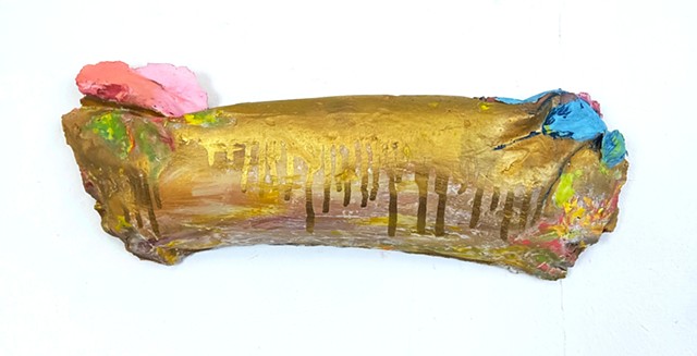 polyurethane foam, wood, steel rods, paint, bungee cords, miniature piggy bank, ceramic bowl, paint-tube cap