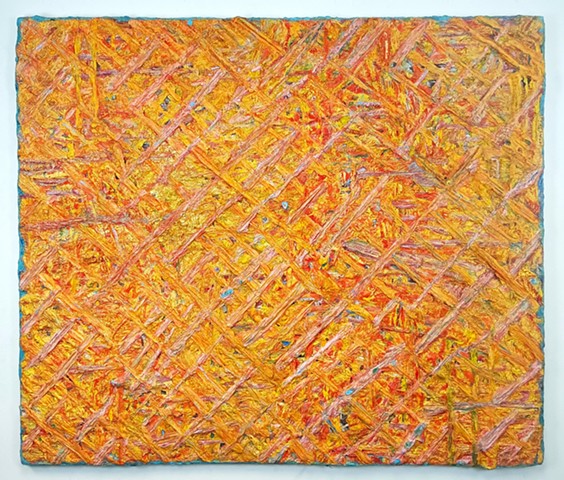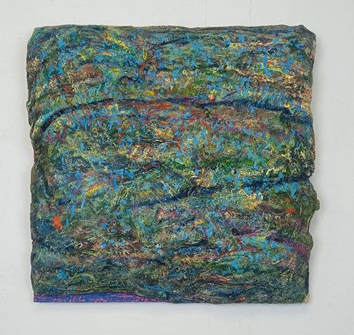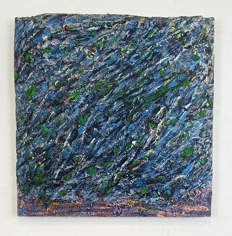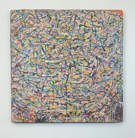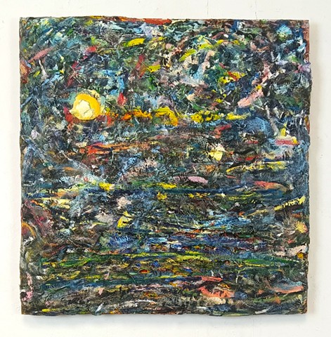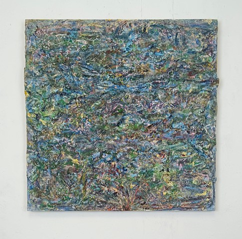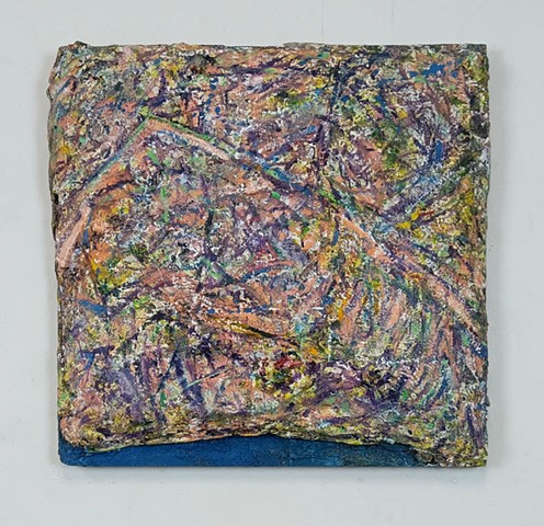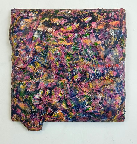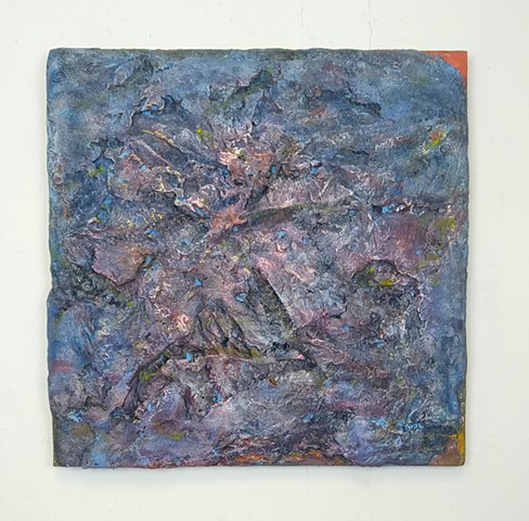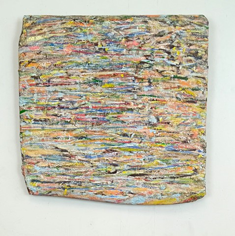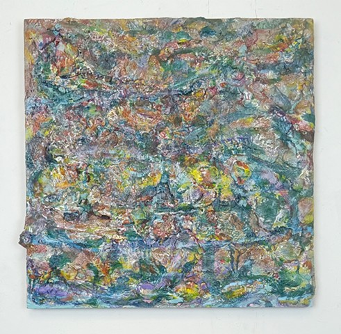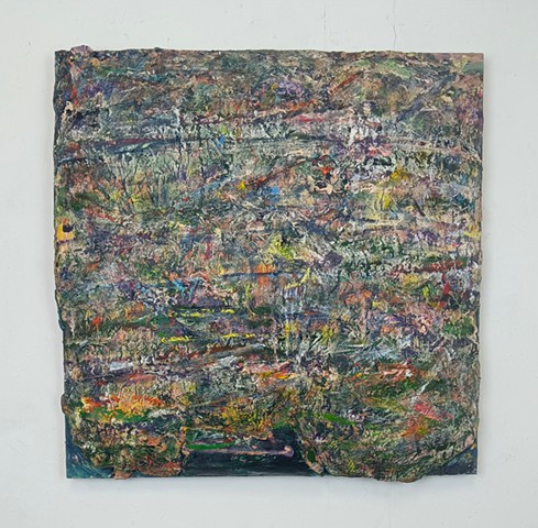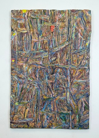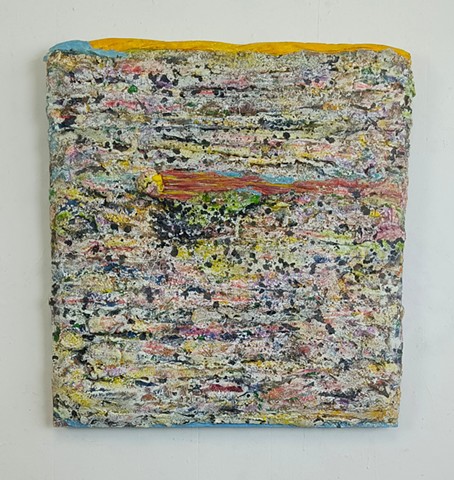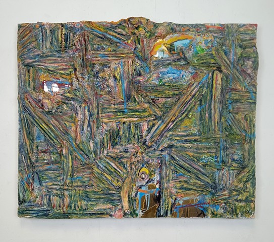 mirrored glass, paint and paper put through washing machine, graphite (television dictation mixed with dreams) iodine on wood panel