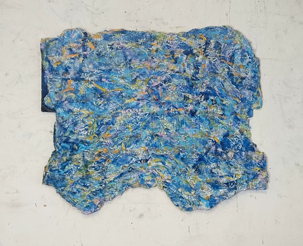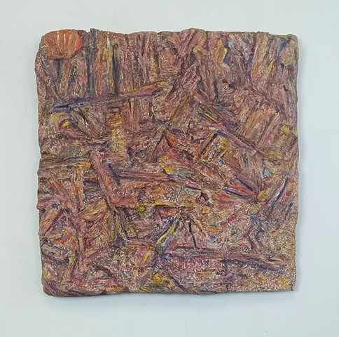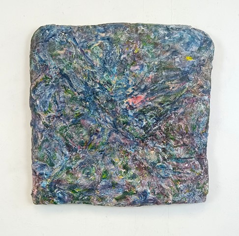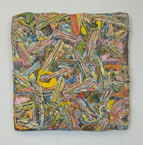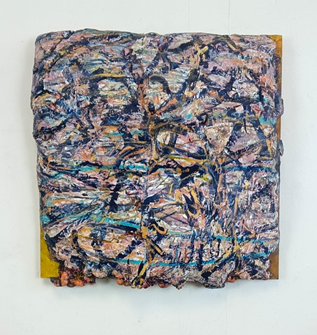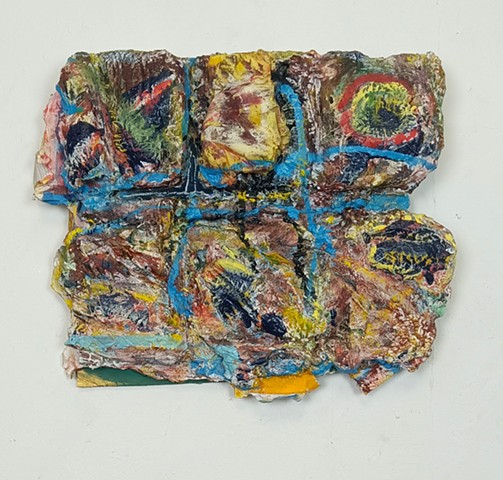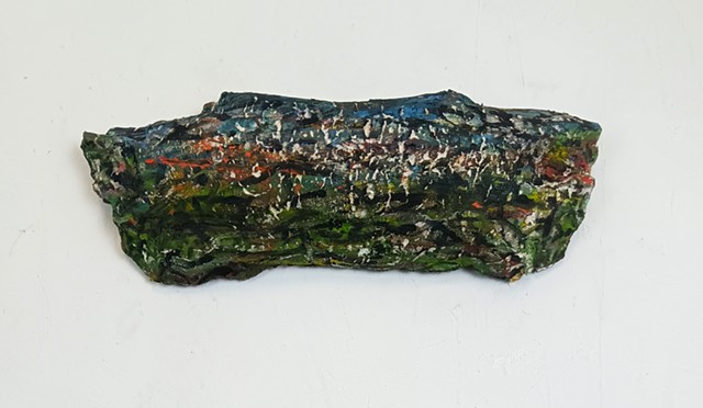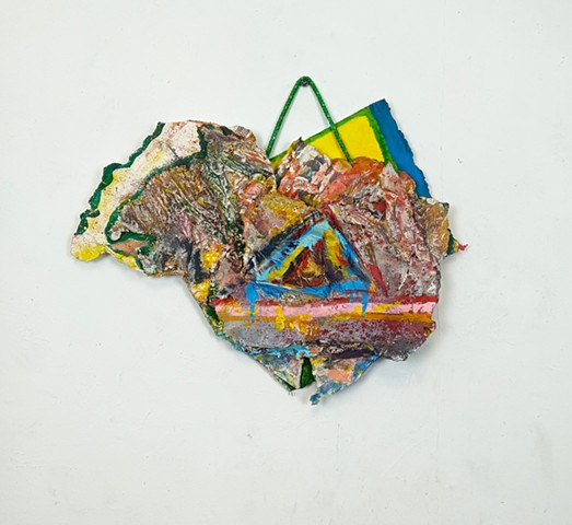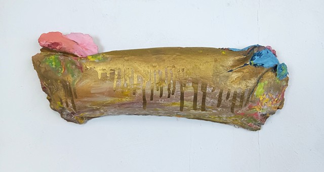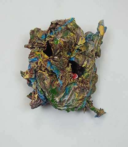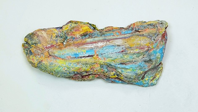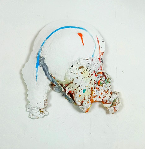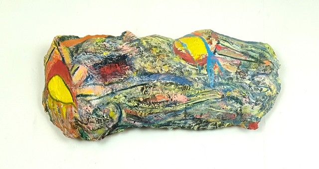 polyurethane foam, wood, metal rods, paint, bungee cords, ceramics, paint tube cap