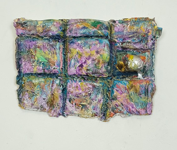 foam, bed post, mirrored glass, photographs, pillow, box-spring spine, steel rods, right angle, pastel, plaster, paint, birthday decorations, vinyl, cross charms, plastic jewels and polystyrene.