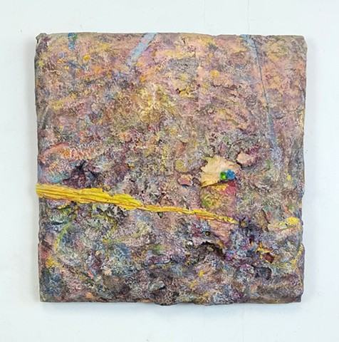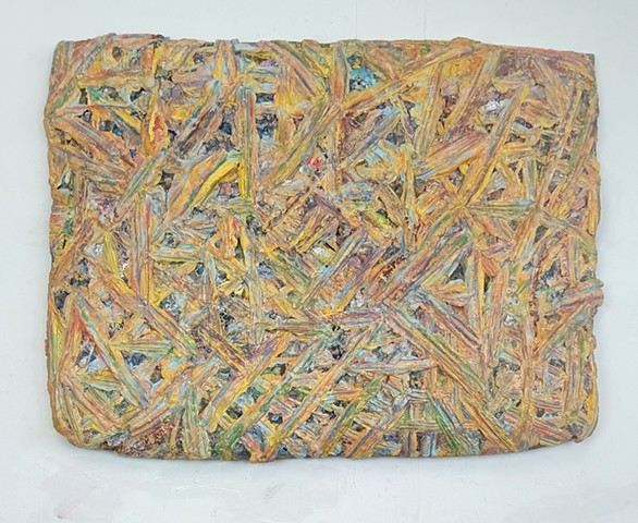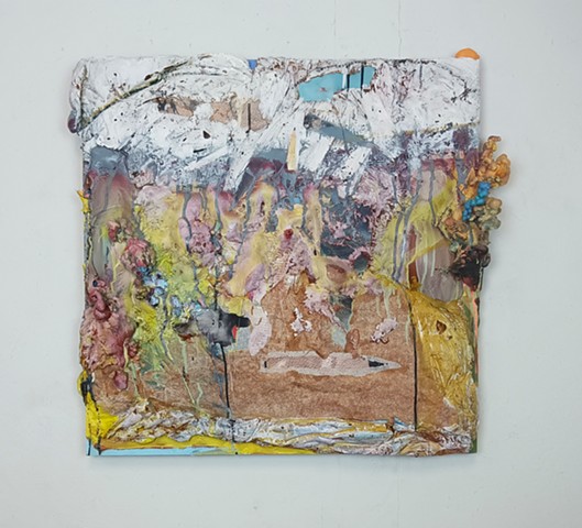 mirrored glass, foam, pink and yellow duct tape, stickers, plaster, party decorations, wood and paint.